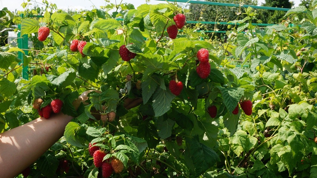 Красавица-малина мудрое растение – не спешит рано цвести. Заморозки завершились и она зацвела, вредителям было холодно, не комфортно, влаги в почве достаточно – вот она и выдала урожай «от души». Каждый побег подвязан к шпалере, нёс хороший урожай. Мы всегда любили малину, её у нас много: Барнаульская, Гусар, Генералиссимус, Жёлтый гигант, Канадский гигант и ремонтантные: Джоан Джи, Химбо топ, Полка, Полана, Жар-птица, Пингвин и т.д. Что называется – выбирай на вкус! Основному малиновому ряду более 20 лет, ни разу не перекапывала, обязательная вырезка двухлетних побегов после сбора урожая, постоянный слой мульчи в ряду до 15-20 см, который помогает сберечь влагу летом и способствует биодинамическому питанию растений. Вот и всё, что нужно малиновому кусту – подходи, собирай урожай необыкновенно крупных, вкусных, чистых ягод!