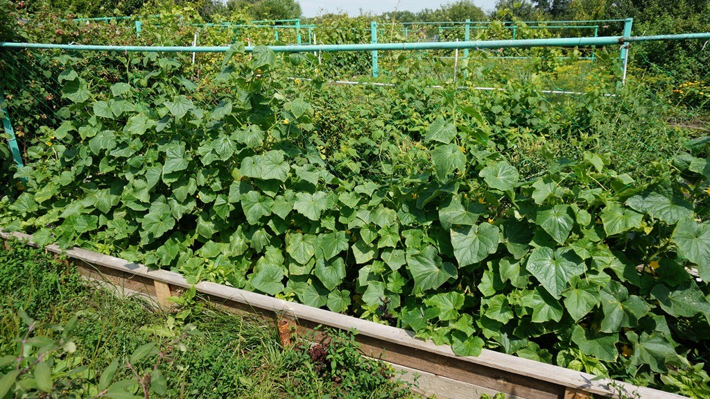 Огурцы рассадой были высажены в теплую грядку по спанбонд – я всё их берегла: а вдруг ночью холодно, вдруг ветер?! Грядка заправлена перегноем, перлитом, в лунку уложена хорошая горсть нарезанной свежей крапивы. Поливы чередовались с подкормкой травяным настоем. Урожай был тоже хорошим – и свежими наелись, и на консервирование, и на салаты. Плодоношение продлилось до 20-х чисел сентября.