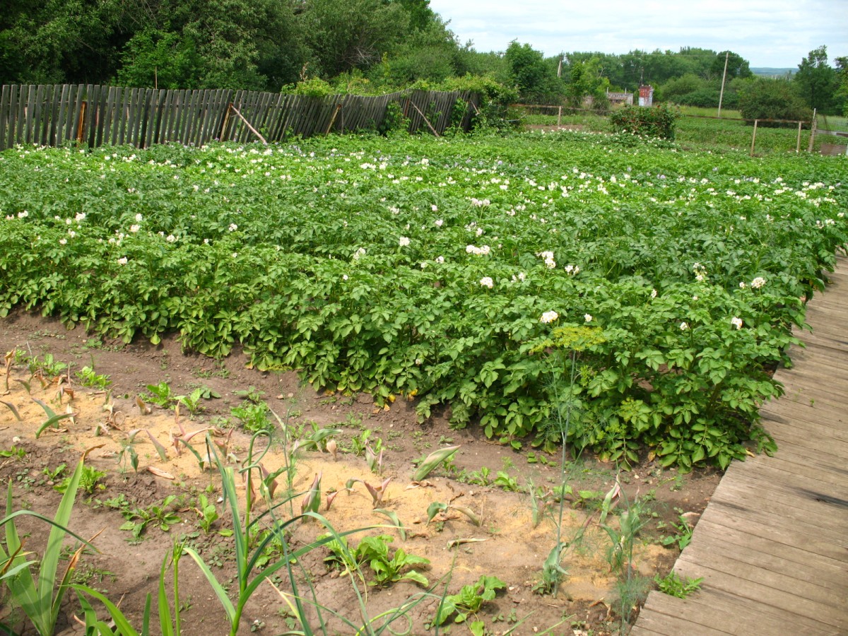Посадка в обычные сроки – 1 декада мая 6 числа. Посадили в гряды в две строчки, в шахматном порядке, с расстоянием 30-35 см между кустами. Каждый из этих рядов крайний, до следующего ряда соседней грядки 0,9-1,0 метр, то есть очень хорошие условия для роста и развития. Междурядья заложены толстым слоем мульчи – соломы. Грядки свободно и быстро прогреваются майским солнышком, так как посадка довольно мелкая 7-8 см – всходы появляются через 8-10 дней очень дружные, мощные. Уже 2 года от колорадского жука пользуюсь только «Престижем», то есть обрабатывается только семенной материал перед посадкой. Всходам колорадский жук уже не страшен – растут здоровые и неповрежденные. Дождались первого хорошего дождя. И, вместо того, чтобы окучивать картофель, мы заложили гряды соломой довольно толстым слоем 15-20 см. Там, где не хватило соломы, использовала полуготовый компост, прошлогодние листья. Мульча в междурядьях так и осталась на всё лето. Вот в принципе и все работы на картофельном участке.