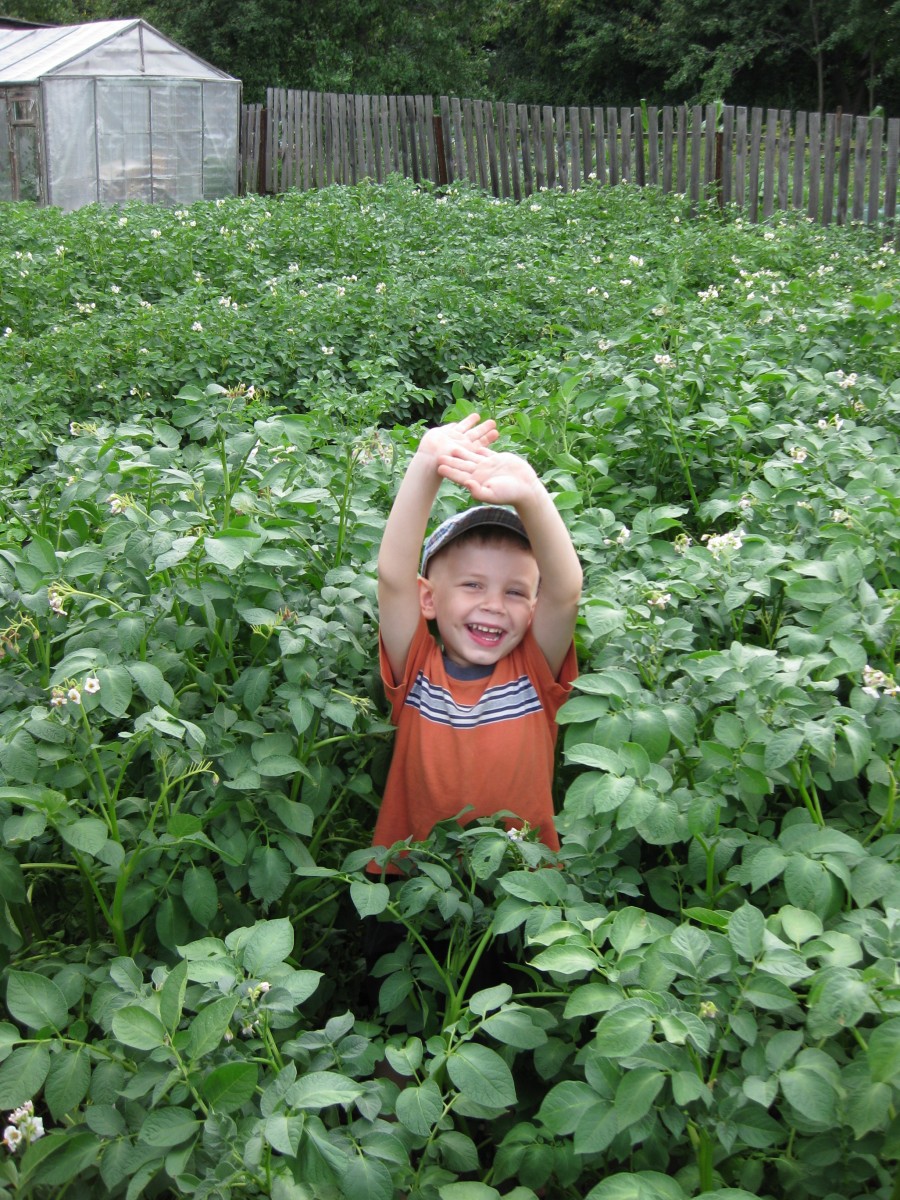 Начну со «второго» нашего хлеба – картофеля. Грядки постоянные, нарезаны по всему огороду уже более 12 лет тому назад. С тех пор не копаются лопатой, не пашутся – то есть без оборота пласта. Почва с тех пор только наращивает свою силу-«плодородие». Это видно на глаз, на ощупь руками – она стала рыхлой, структурной, можно на ней работать без инструментов – руками. Уже много лет замечательно работает мульча в виде соломы, травы, листьев, картона.