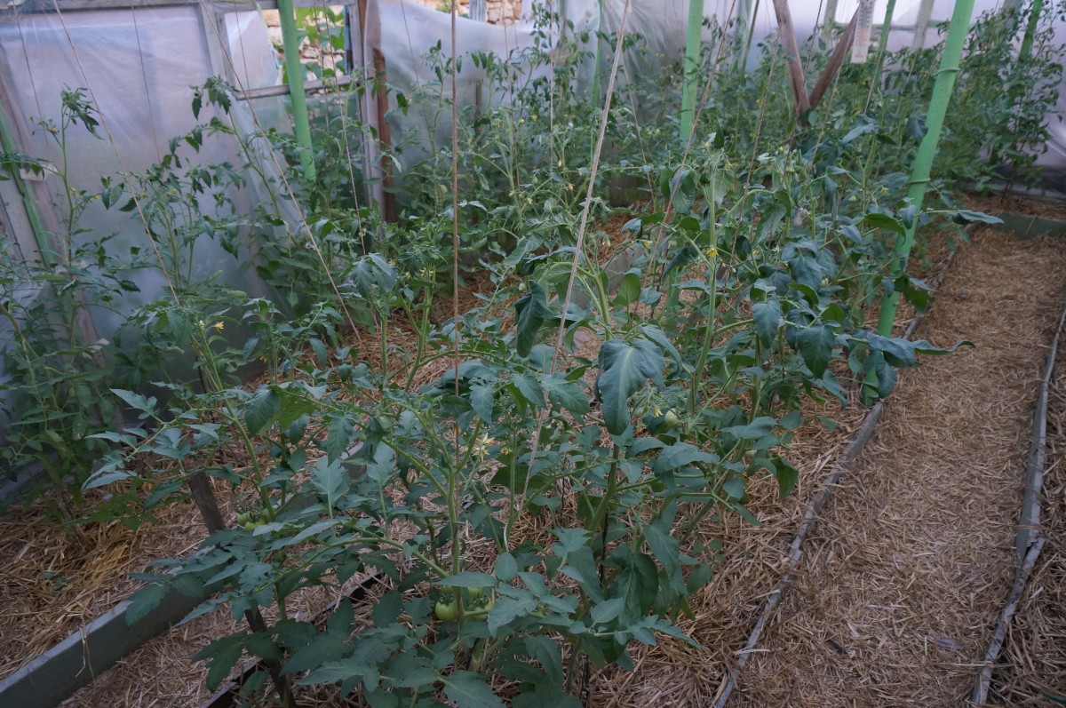 Такую же тёплую грядку мы делаем и в теплице – с 40-45 растений индетерминантных сортов получаем до 300 кг томатов. Полив в теплице минимальный, редкий, но обильный. Вся поверхность грядок и дорожек заложена толстым слоем соломы. Уход сводиться к пасынкованию – оставляю один пасынок под первой кистью, т. е. веду в два стебля. Удаляю нижние листья в то время, когда полностью сформируется первая кисть до неё, потом вторая и т. д., т. е. ноги у растения голые. Удалять следует не более 1-3 листьев за раз и не поливать томаты в этот день. Ранка должна подсохнуть.
